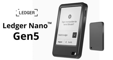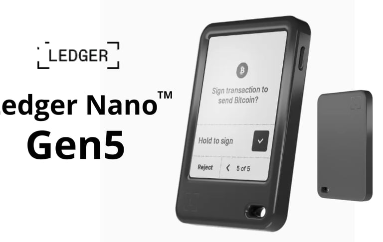 Billetera hardware Ledger Nano Gen5, versión más reciente con pantalla mejorada y conexión Bluetooth, ideal para guardar y gestionar criptomonedas de forma segura desde el móvil.